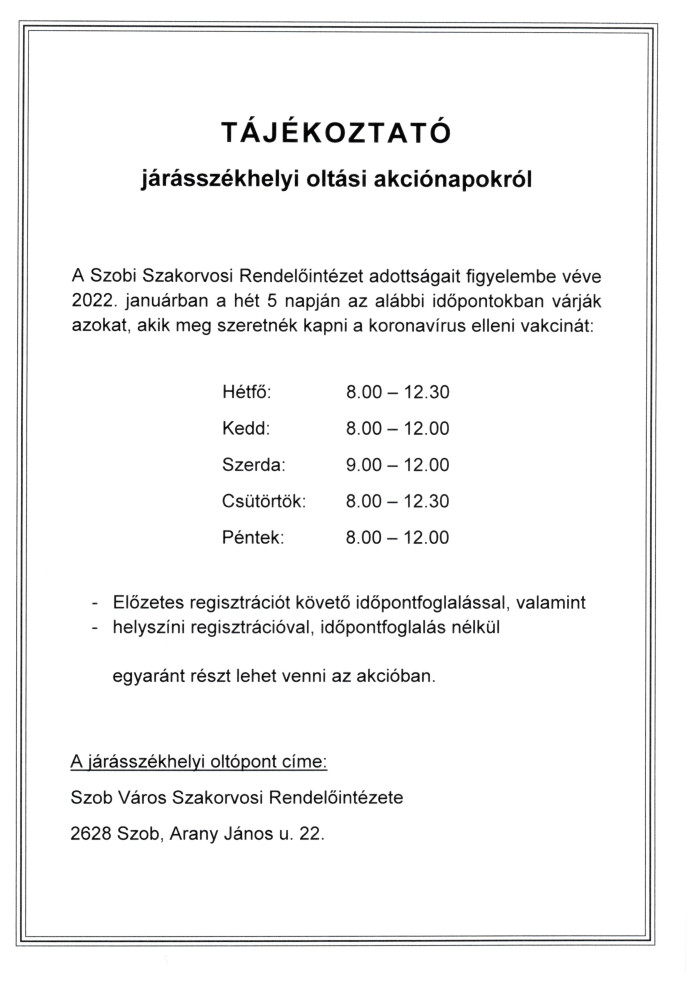 Tájékoztatjuk Önöket,hogy 2022. január 14-én ( pénteken) 14-18 ó-ig, valamint 2022. január 15-én ( szombaton) 10-18 ó-ig lehetőségük lesz Covid-19 elleni védőoltásra.