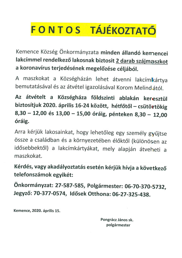 Tájékoztatjuk kedves betegeinket, hogy a háziorvosi rendelés 2020.05.29-én pénteken Kemencén és Perőcsényben az alábbiak szerint változik:
