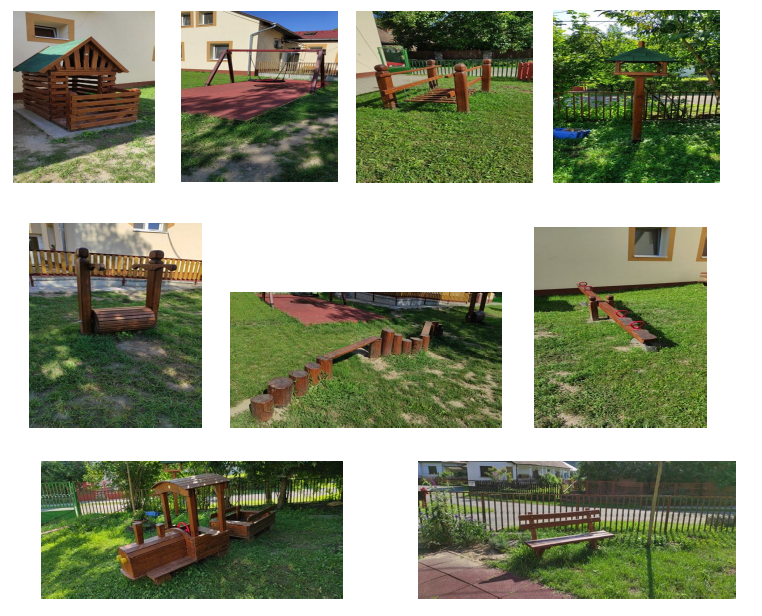 1 db babaház, 1 db rönklépegető, 1 db láncos lépegető, 1 db mókuskerék, 1 db vonat, 1 db 4 üléses mérleghinta, 1 db fészekhinta, 2 db pad, 1 db madáretető, 24 m2 ütéscsillapitó gumi, fakeret.